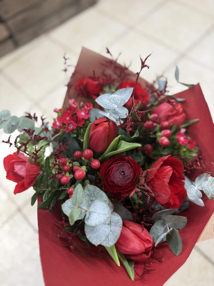 Bouquet rouge de fleurs de saison composé d’anémones, tulipes, renoncules et œillets de poète.