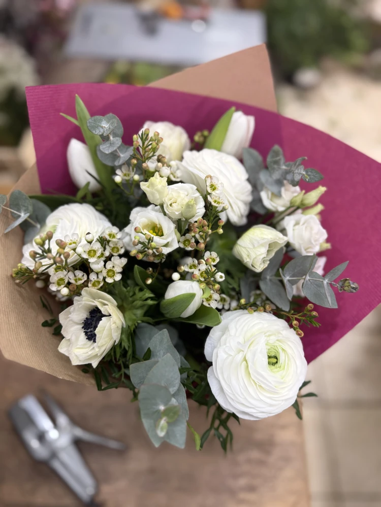Bouquet blanc de fleurs de saison composé de renoncules, wax, anémones, tulipes, lisianthus et eucalyptus